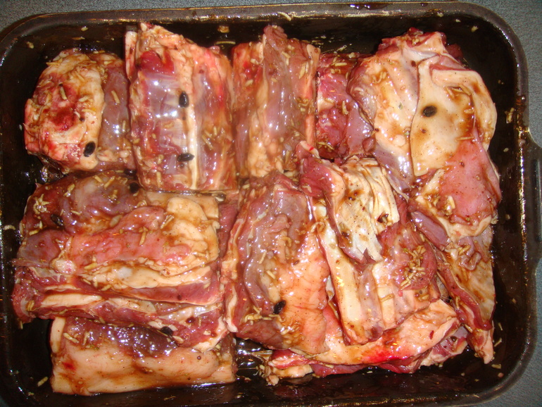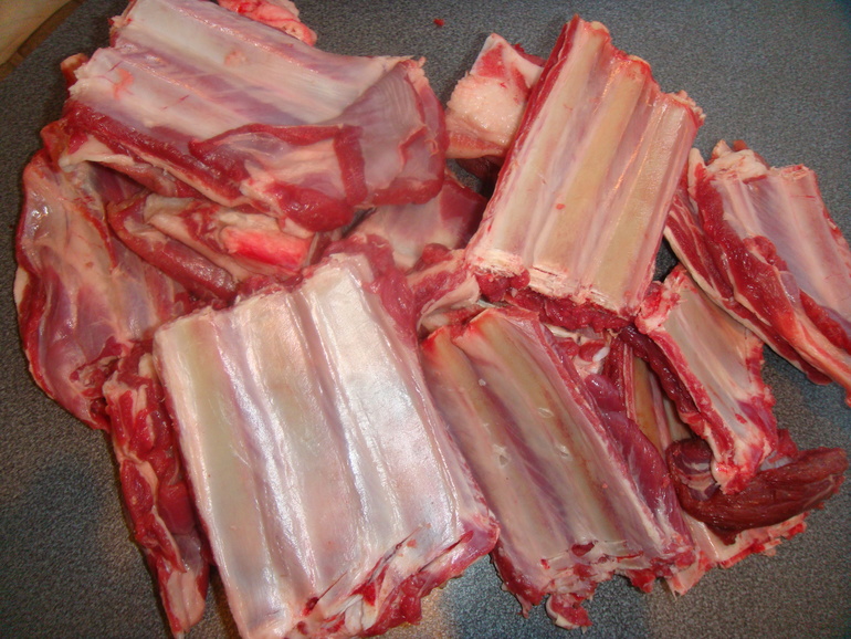 Подготовить кости курицы, утки, свинины, грудинку говядины и баранины: