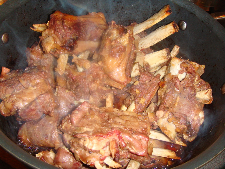 Перемешать кусочки, закрыть казан фольгой и запекать в духовке. Затем довести до румяной корочки, сняв фольгу: