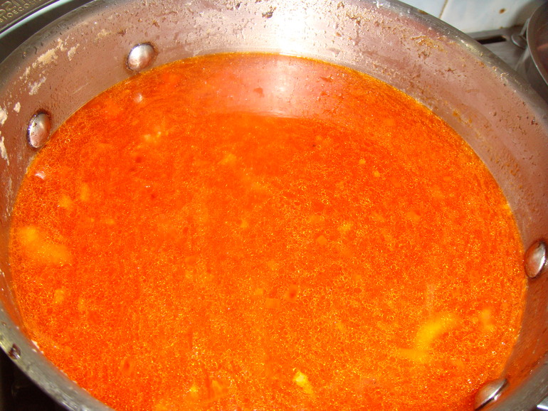Слить получившийся сок в сковороду, где обжаривались грудки, добавить туда же оставшийся маринад, выдавить сок 1 апельсина. На среднем газу выпарить соус до загустения: