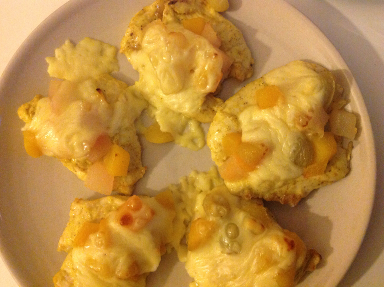 Куриные грудки нарезаем на кусочки, у меня из целой грудки получается 8 шт. Я делаю сразу две, съедается моментально. Кусочки филе солим, перчим, добавляем карри чуть меньше 1 ст.л., майонез 2-3 ст.л., перемешиваем и оставляем можно на ночь можно и часа на 3. Хорошо разогреваем духовку до 180 градусов. Противень чуть-чуть смазываем маслом, выкладываем филенки и сверху на каждый кладем пол кольца консервированного ананаса, у меня была смесь фруктов, получилось тоже очень вкусно. Ставим все в духовку, через 10 минут сверху кладем брусочек сыра( брусочек что бы плавился подольше) еще через 10 минут готово!! У меня было готово уже через 15, но духовка должна быть горячая! Эту курицу важно не передержать!!! Очень необычное сочетание соленого сладкого и карри.