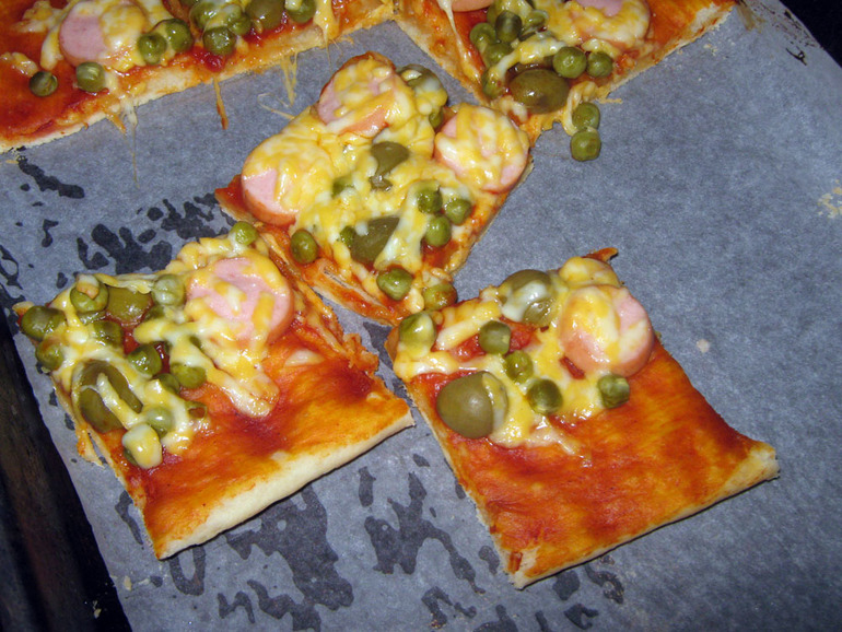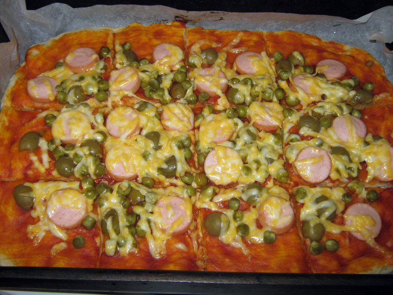 Форму для запекания застилаем пергаментом и смазываем растительным маслом. Выкладываем тесто, разминаем, формируем бортики. Смазываем томатной пастой или соусом для пиццы. Сверху выкладываем молочные сосиски, оливки и зеленый горошек. Посыпаем тертым сыром.