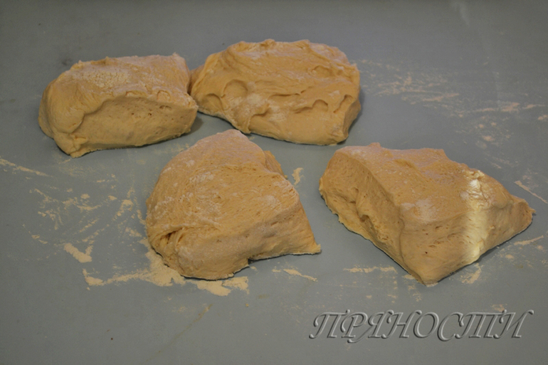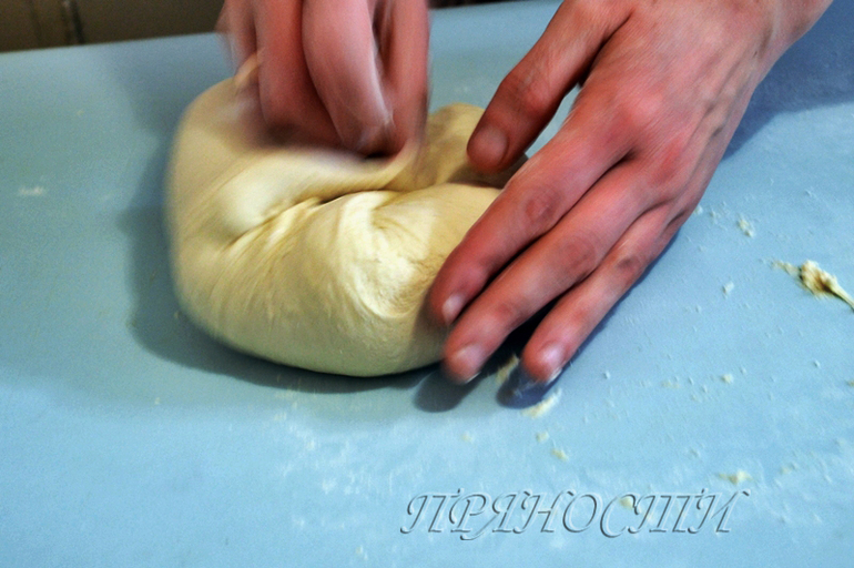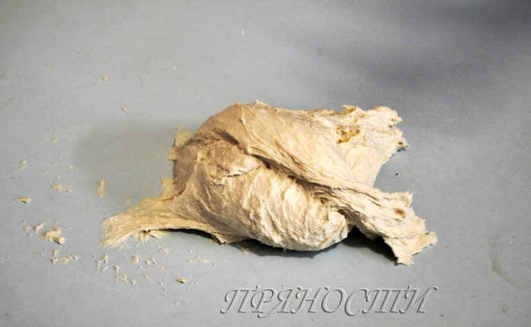 Перекладываем наше тесто на рабочую поверхность ,НЕ ПОДПЫЛЕННУЮ МУКОЙ!- и начинаем работать.Берем тесто двумя руками с двух сторон,отрываем его от рабочей повехности,немного как бы растягиваем руками,поднимаем вверх,и с силой кидаем на стол-отбиваем его. Наша задача соеденить воедино все ингридиенты,при этом максимально насытить тетсо кислородом.