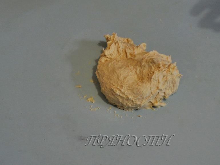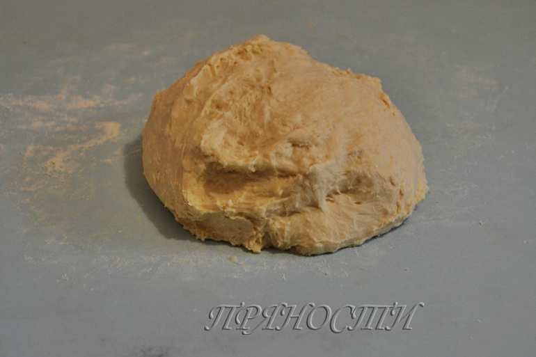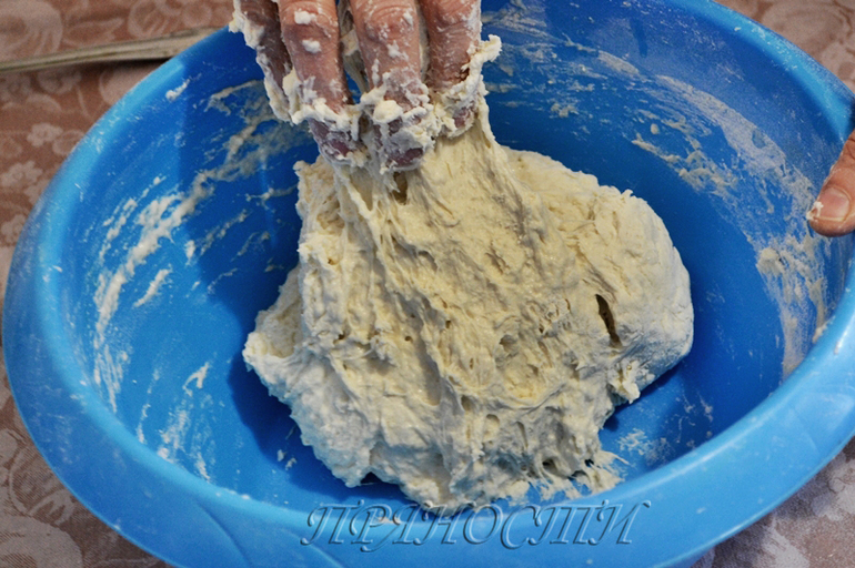 Проводя аккуратно рукой вдоль стенок миски,поворачивая ее по часовой стрелке собирайте тесто в комок-ни в коем случае не нужно его начинать месить- просто собираем тесто в достаточно жидкий комок- несколько минут достаточно.