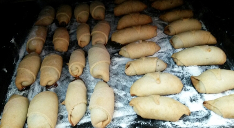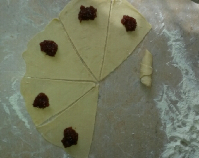 Маргарин растопить на огне, остудить при комн. температуре. Добавить остальные ингредиенты. Муку в последнюю очередь. Добавлять постепенно, замешивая тесто. Оно не должно быть слишком "тугим". Готовое тесто оставить на 30 минут. Я накрываю миску крышкой, чтоб тесто не заветрило. Затем раскатываем колбаской, делим на 5 частей. Каждую часть раскатываем в тонкую лепешку. Разрезаем её на 8 частей-треугольничков. На каждый треугольник - примерно чайную ложку густого варенья (можно вареной сгущенки). Скручиваем треугольники в рогалики. И в духовку на 180 град., 25-30 минут.