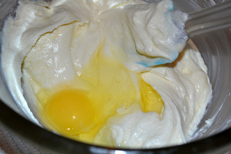 Для начинки сыр смешать с сахарной пудрой и ванильным сахаром на самой малой скорости миксера, добавлять по одному яйцу каждый раз вымешивая массу до однородности (не старайтесь взбить массу, просто аккуратненько перемешиваем)