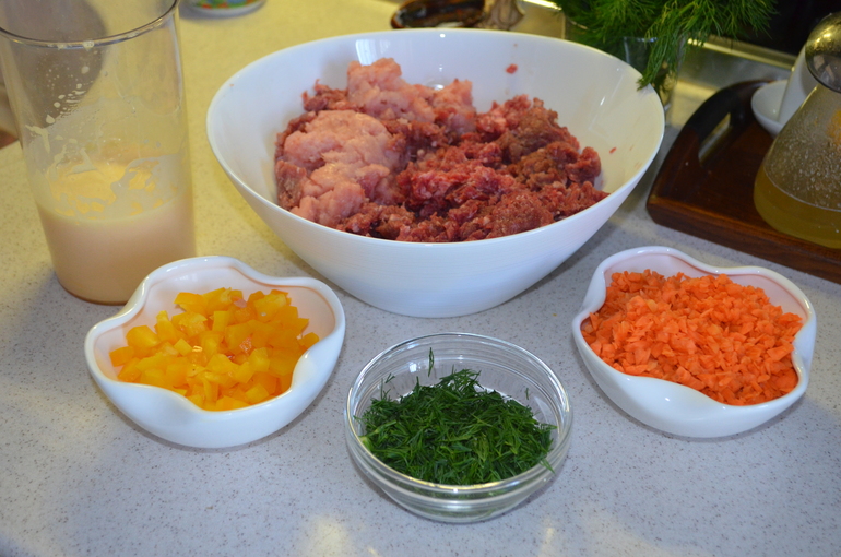 Соединить два вида фарша с яйцами, зеленью, перцем, морковью, хлебной крошкой и тщательно вымесить.