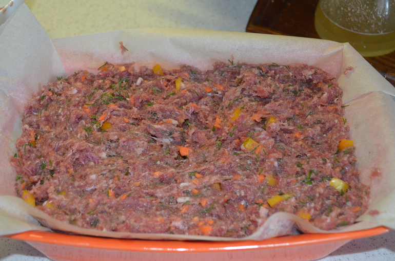 Выложить форму для кекса пергаментной бумагой. Поместить в форму фарш. Запекать в духовке при 180 гр 1.5 часа.