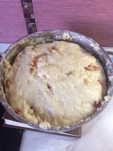 Когда тесто увеличится в объеме в 2 раза, вынуть его из воды, вымесить, потом добавить яйца, растертые с маслом и сахаром, снова вымесить так, чтобы тесто отставало от стенок посуды. Добавить изюм (у меня был урюк и цукаты).
