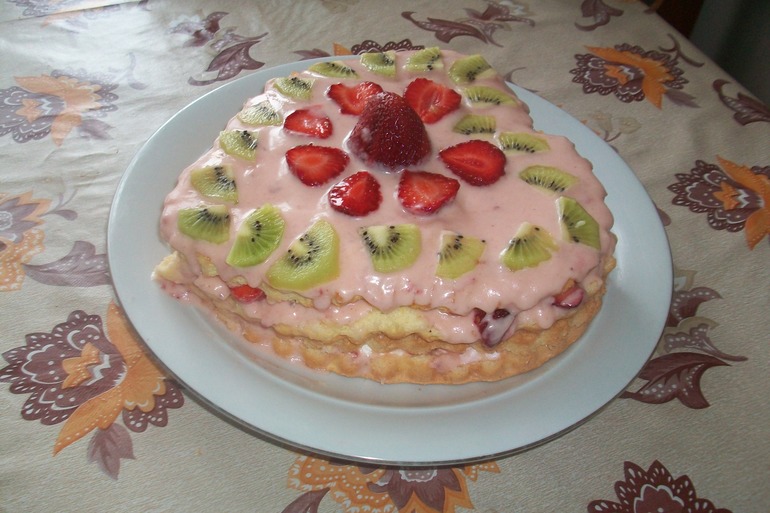 Спасибки)))Два бисквитных коржа ( в силиконовой форме пекла). Первый слой крем(клубника взбитая со сметаной и сахаром)+зефир, второй — крем+банан, третий — крем+клубника, ну и собственно верхний слой видно. Жаль мне можно слюнки попускать на ГВ. В следующем году приготовлю, попробую)