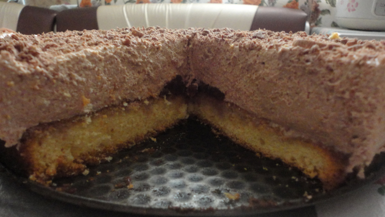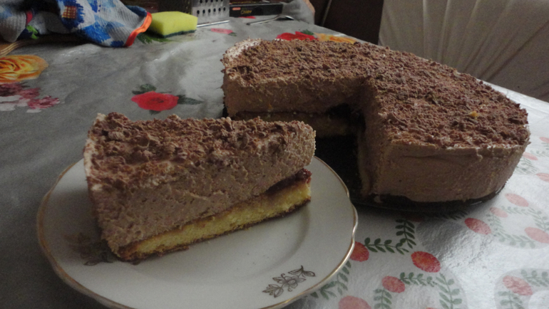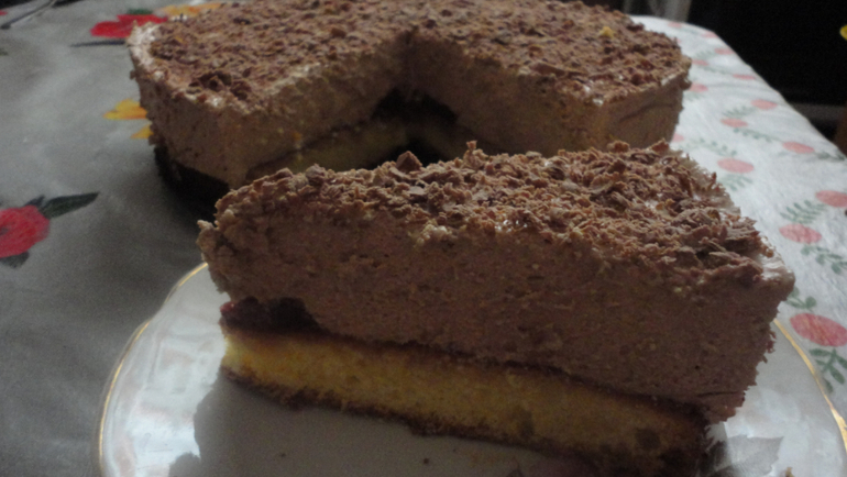Залить корж в форме этой смесью и охладить(у меня застыл за 2 часа)Готовый и охлажденный торт посыпала тертым шоколадом.