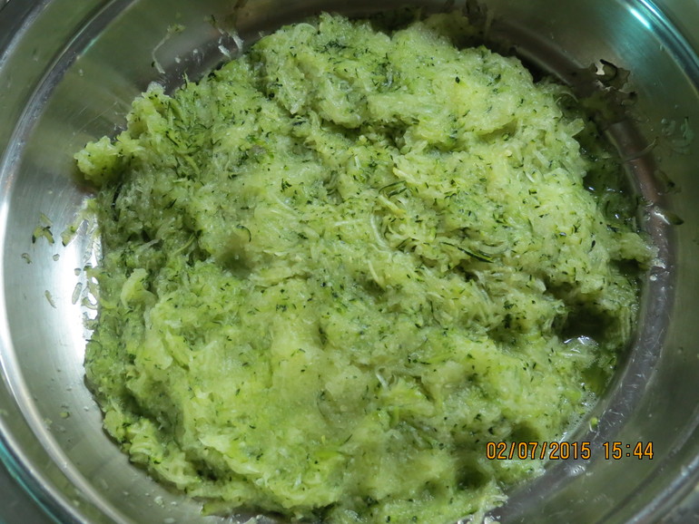 На средней терке трем 2 средних кабачка ( у меня были цукини), сливаем лишний сок.