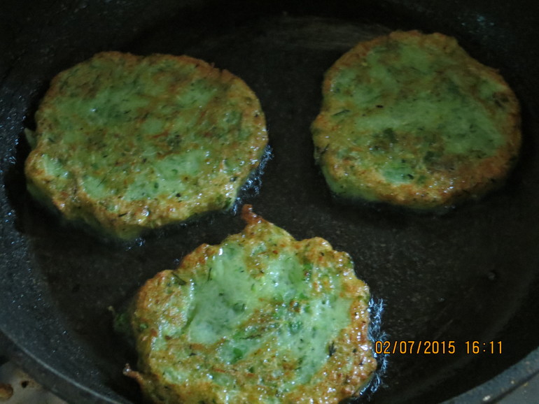 На прогретую сковороду наливаем масло и выкладываеи столовой ложкой полученное тесто, поджариваем до румяной корочки.