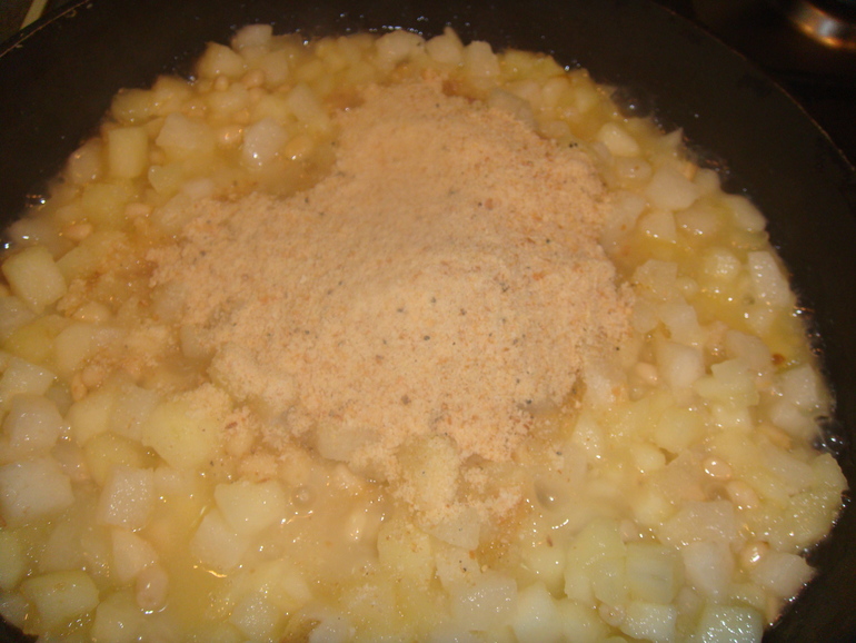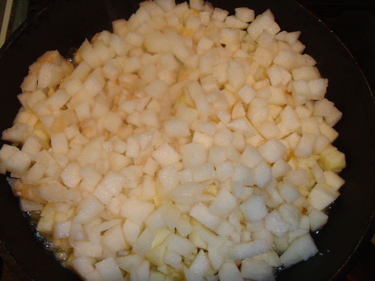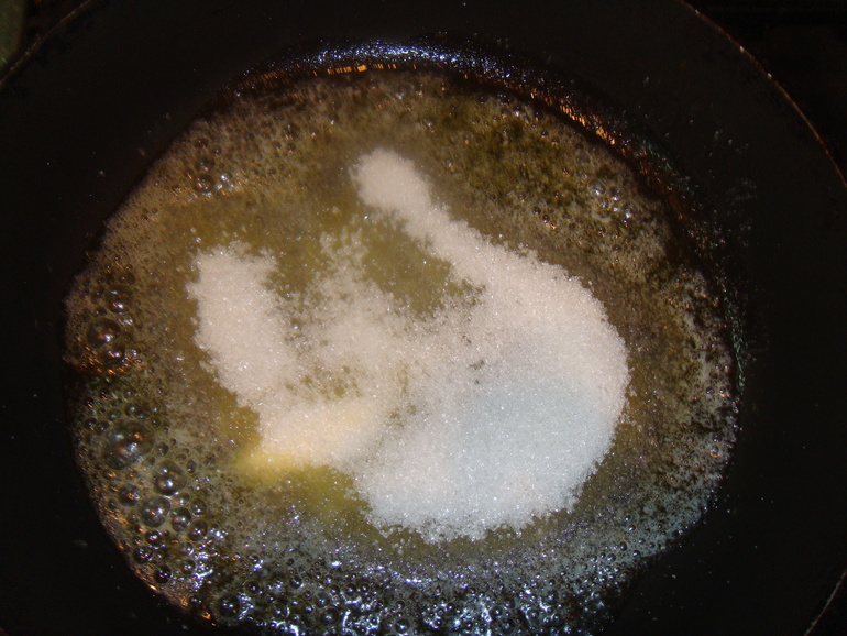 Очистить, нарезать кубиками. Нагреть на сковороде 3 ст.л. сливочного масла с половиной стакана сахара и 1 ч.л. корицы: