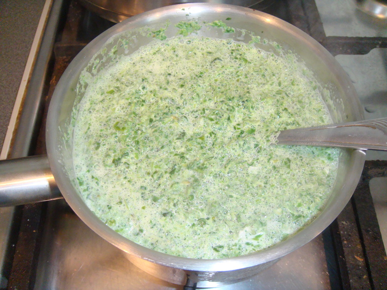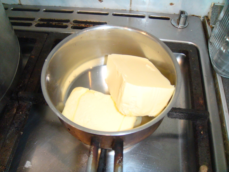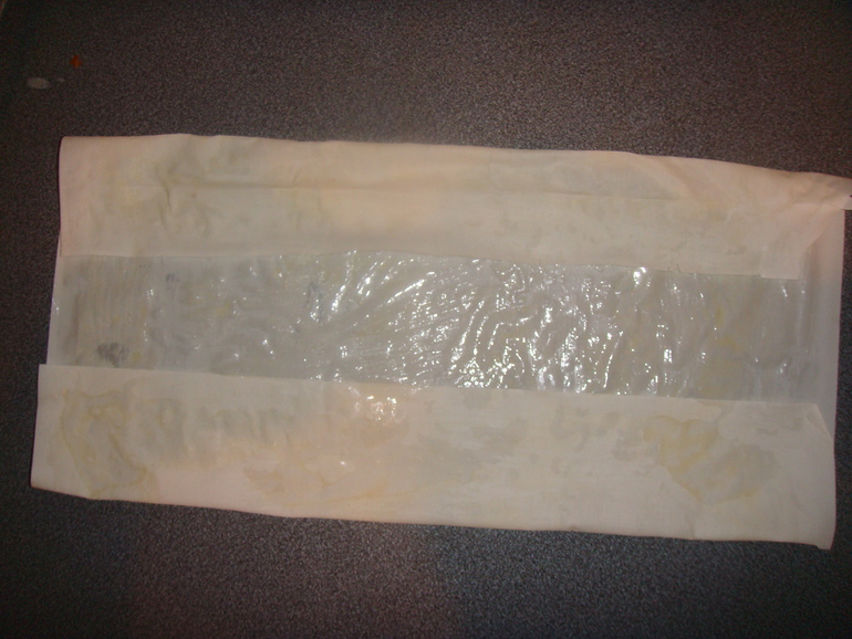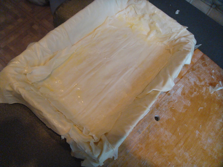 Укладывать в форму пласты теста, тщательно перемазывая маслом: