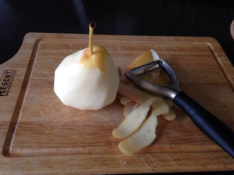 А потом в мискам творогом добавляем масло, взбитые яйца, грушу. Перемешиваем. Тихонько добавлЯем муку и разрыхлитель