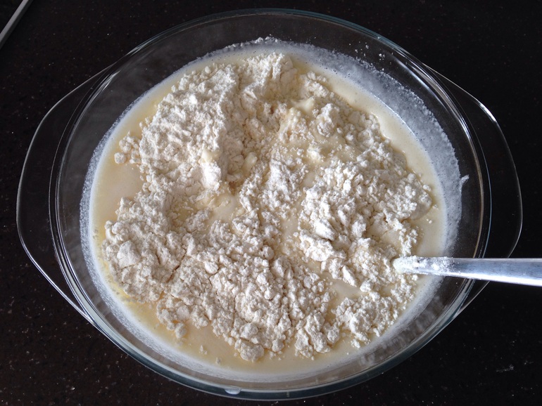 Муки добавляем столько, чтобы тесто не лилось с ложки, но было весьма липким