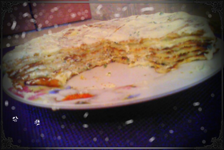 Блины я обжаривала на растительном масле ( по рецепту было на сливочном). Разогреваем сковороду и выкладываем где то по 2 ст.л. теста , разравниваем ложкой и обжариваем с 2-х сторон до готовности. В итоге получилось 6 блинов! Как остынут, каждый смазываем кремом и в холодильник минут на 20, чтобы застыл чуть чуть! Приятного аппетита девочки:-)!!!!