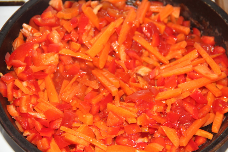 2. Режем соломкой морковь, перец кубиками. Бросаем в разогретую сковороду с раст. маслом с добавлением помидор в собственном соку. Тушим 20 мин.