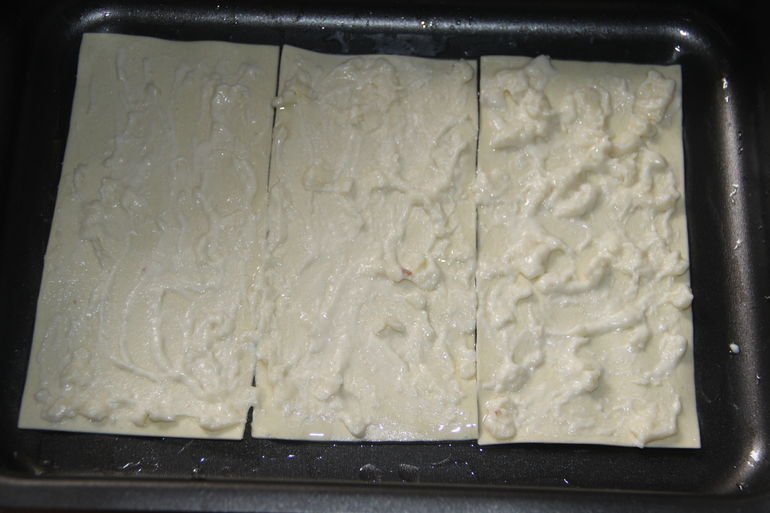 5. Снова выложить пласты и смазать соусом и посыпать сыром.