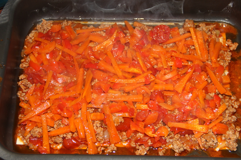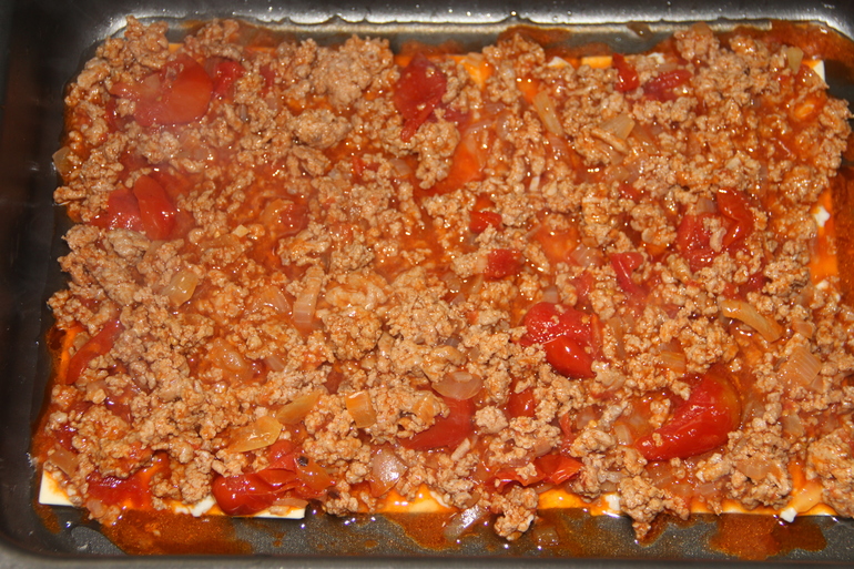 Повторить еще раз: Пласты, соус, смесь с фаршем....