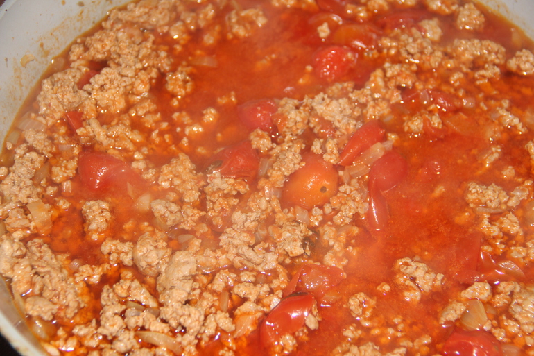 1. Пережариваем фарш на раст. масле. Затем добавляем порезанный лук, чеснок и помидоры в собственном соку. Тушим 15 минут.