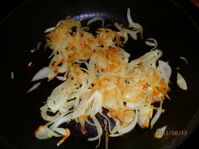 В сковороде разогреть растительное масло, лук и чеснок немного подрумянить.