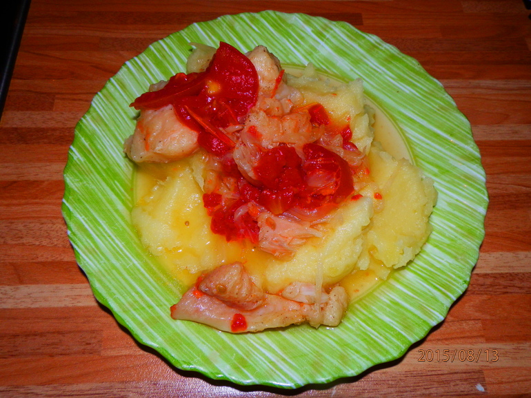 На гарнир можно подать отварной рис, или отварной картофель. У меня было сегодня картофельное пюре, сверху посыпать любимой зеленью. У меня сегодня не оказалось зелени. )))))