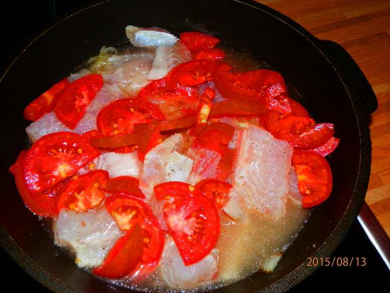 Сверху положить куски рыбы, и помидоры.