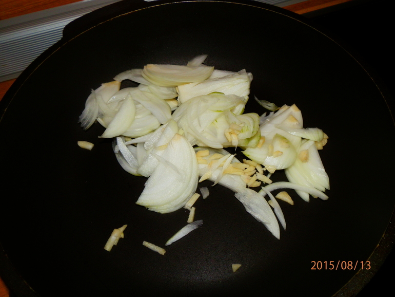 Репчатый лук нарезать полукольцами,чеснок мелко порубить.