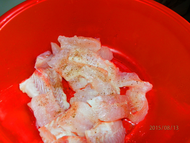 Рыбное филе вымыть, обсушить нарезать небольшими кусочками. Кусочки филе поперчить, посолить, сбрызнуть лимонным соком.