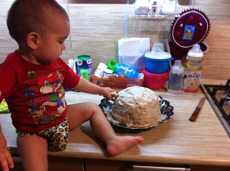 1.Яйца взбить с сахаром и солью, постепенно подсыпая муку и подливая молоко, замесить тесто. Затем добавить соду, шоколад, растопленный в небольшом количестве молока, немного рома. Выпечь и остудить.(Я вместо шоколада добавляю кокао порошок)
