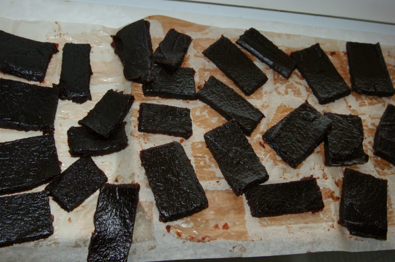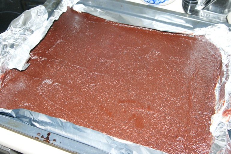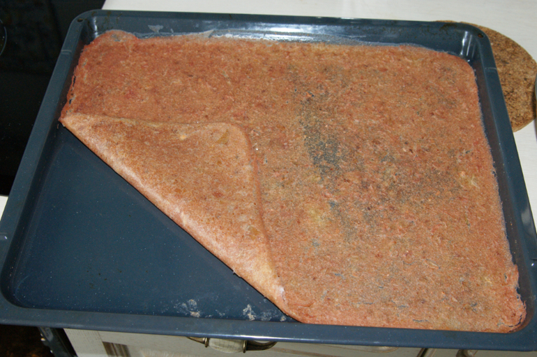 Уваренную массу заливаю на противень застеленный фольгой, сверху накрываю бумагой для выпечки и ставлю на холодильник сушиться. Сушится он тоже долго, первая партия почти неделю сушилась, сейчас вторая досушивается.