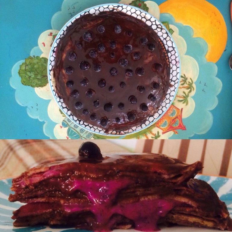 Блинный торт политый шоколадной глазурью с прослойкой заварного крема из черной смородины!