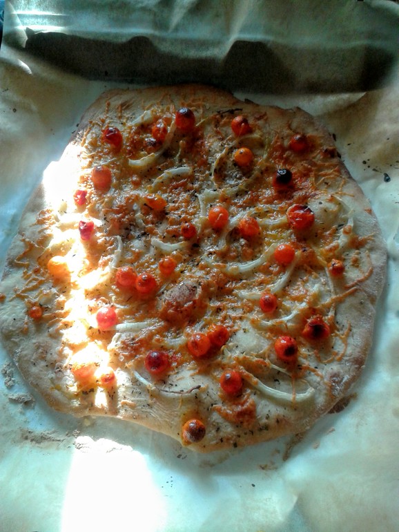 Но я не люблю пышную, я люблю тонкую. 300мл теплой воды, туда чайную ложку дрожжей, 8ст.л.оливкового масла и около 3 стаканов муки. Заместили, оставили. Раскатываю тонко.