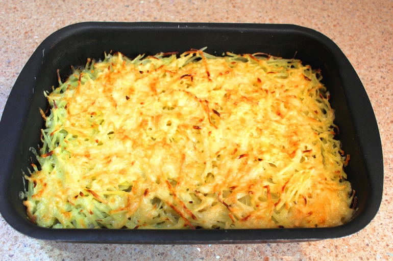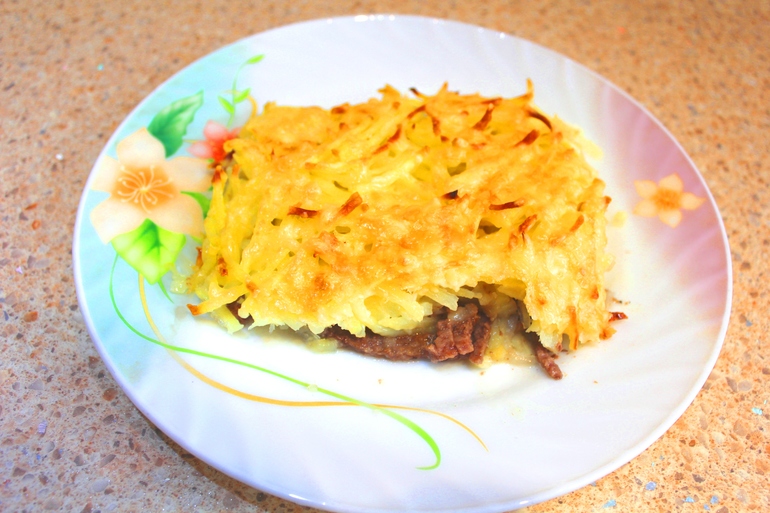 Мясо порезать тонкой соломкой (лучше, если мясо будет слегка подмороженным, будет легче порезать). Выложить в форму для запекания, посолить, поперчить. Сверху выложить колечки лука. Картофель почистить, нашинковать на корейской терке тонкой соломкой. ВНИМАНИЕ! Картофельную соломку опустить в холодную воду для того, чтобы смыть лишний крахмал. Картофель выложить на бумажное полотенце, слегка обсушить. На слой лука выложить картофельную соломку, разровнять, посолить по - вкусу. Добавить растительное масло, запекать в духовом шкафу до готовности, затем достать, посыпать тертым сыром и вернуть в духовку для подрумянивания (можно на гриле). Ароматное блюдо готово