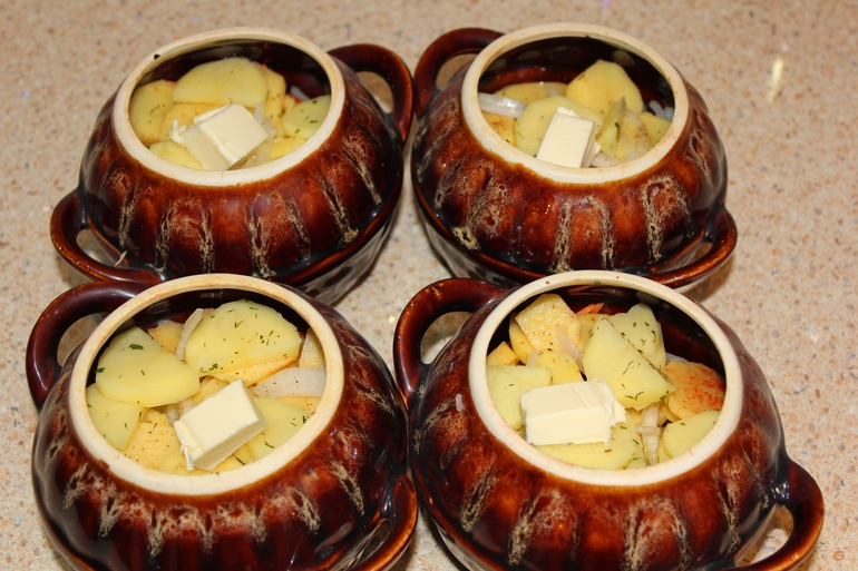 В горшочки добавить по кусочку сливочного масла (30-50 гр)., добавить немного воды (примерно 3-4 ст.ложки)