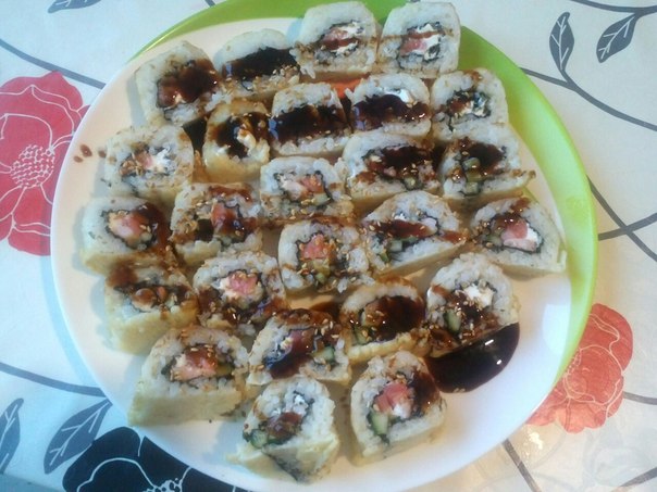 Рецепт взят с сайта автосуши, рис, нори, креветки, огурец, семга, творожный сыр, кляр, кунжут, соус унаги. Посл скручивания роллов разрезала их на две части, обмакивала в кляре и обжаривала на большом количестве масла. Соус унаги красиво поливаться отказался. Рекомендую))