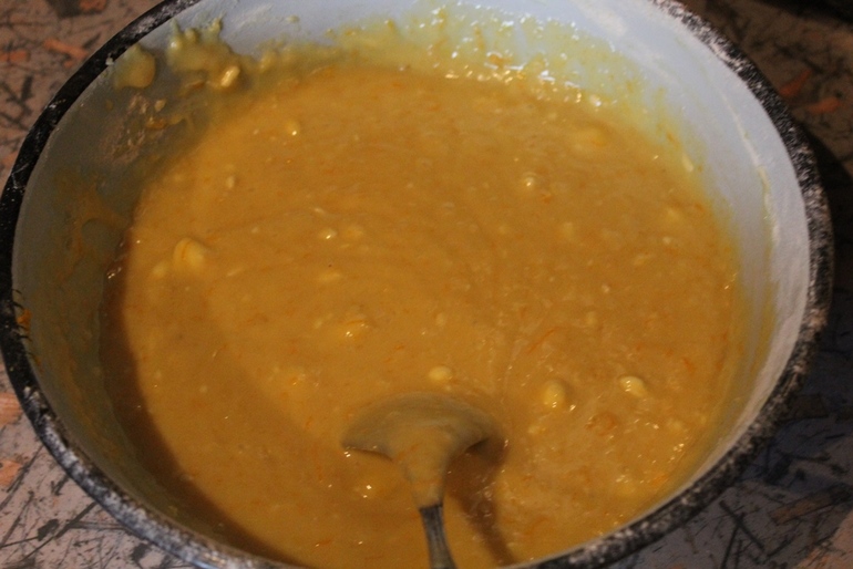 Добавьте к яично-масляной смеси. Туда же натрите цедру двух апельсинов и двух лимонов. Перемешайте.