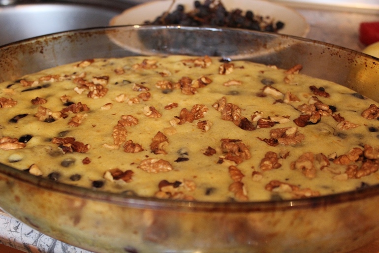 Поставьте в разогретую духовку на 10 минут. Достаньте. Тесто слегка схватилось, но ягоды в него вдавливаются. (я передержала минут пять и уже почти было поздно) Добавьте оставшийся виноград - 450 грамм. Я еще посыпала грецкими орехами - но я всегда стараюсь добавить орехи в ягодную выпечку - мне нравится, что тесто приобретает некую структурность. Как мне кажется, виноград с грецкими орехами идеально сочетается.
