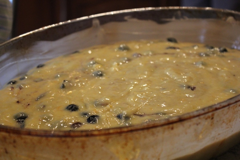 Высыпьте в тесто 150 грамм винограда ( я сыпанула грамм 300). Вылейте тесто в промасленную форму.