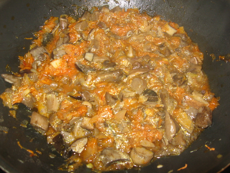 Обжариваем лук до золотистого цвета, добавляем мелко натертую морковь, далее 1 столовую ложку кетчупа ( да, именно кетчуп мне нравиться в зажарке, он придает пикантность, в отличии от томатной пасты) и грибы ( заморозка микса отварных белых, подберезовиков и подосиновиков). Все это тушиться вместе около 5 минут, слегка подсаливается и перчиться. Можно добавить натертые маринованные огурчики, они тоже прекрасно впишутся )