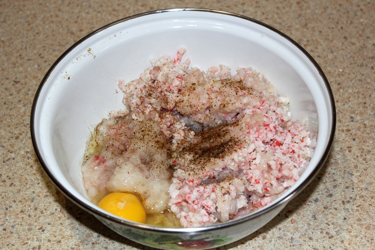 Приготовить фарш из морепродуктов, добавить мелко порезанный репчатый лук (можно прокрутить на мясорубке), черный молотый перец, соль, яйцо
