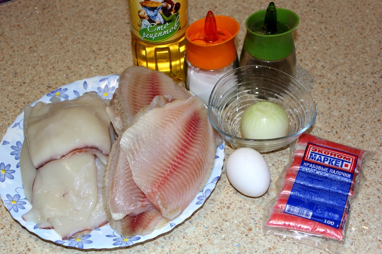 Филе тилапии, тушки кальмаров, упаковка крабовых палочек, лук репчатый, яйцо, соль, черный молотый перец, масло для обжаривания котлет, панировочные сухари