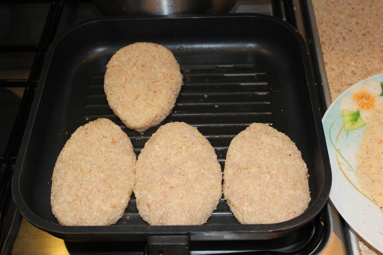Сформовать котлеты, запанировать в панировочных сухарях, обжарить на растительном масле