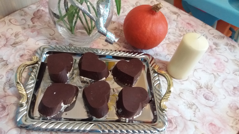 Достаньте формы выложите начинку и покройте сверху оставшимся шоколадом .Теперь в холодильник на пол часа час и отделите формы . Силикон отходит очень легко. Приятного!!!!