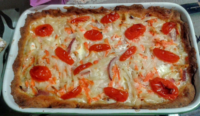 Начинка: маскарпоне, картофель, топинамбур, морковь, брынза, лук. Крупные овощи на терке, лук просто брусочками, брынза кубиком. Смешать все с маскарпоне, выложить на тесто.