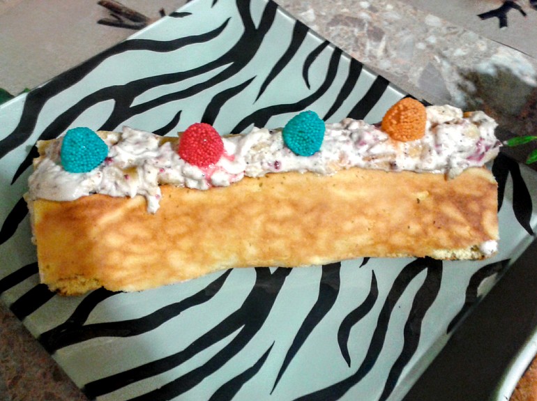 2 яйца взбить в светлую массу со столовой ложкой сахара. Отдельно в миске смешать 55гр муки, 55гр сахара, щепотку соли, разрыхлитель. Аккуратно соединить с яйцами. Размазать по пергаменту ровным слоем. Выпекать в разогретой до 180 духовке 6 минут. Сворачивать горячим.