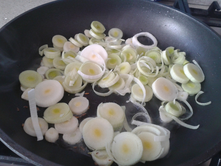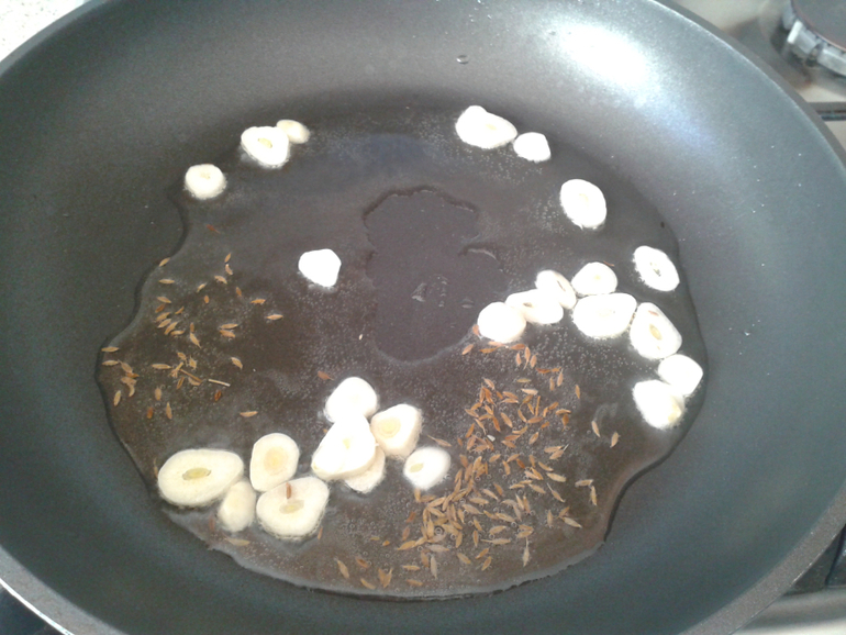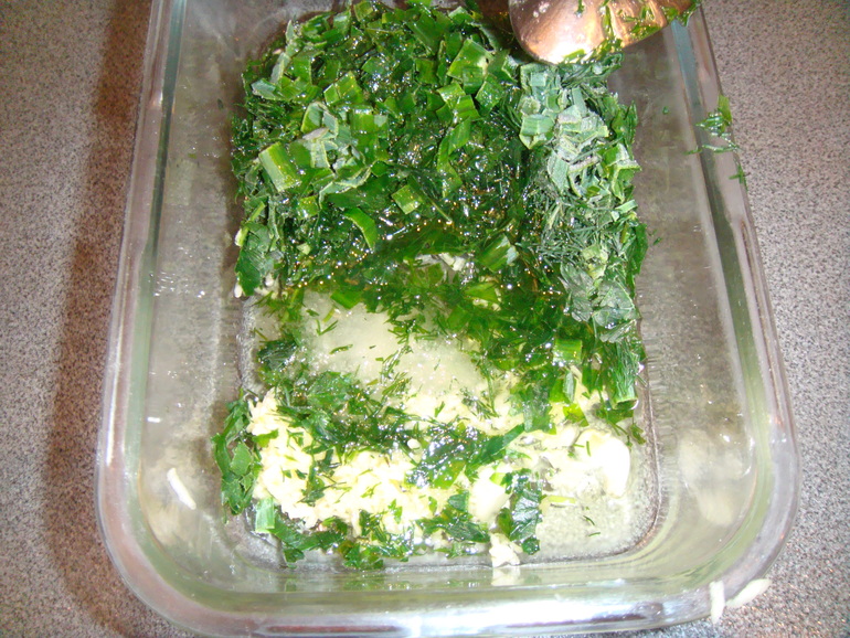 Смешать в миске 3 зубка чеснока, 1 ч.л. крупной соли, 2 ст.л. уксуса, 4 ст.л. оливкового масла, пучок зелени (кинза или петрушка, стрелки чеснока, немного укропа):