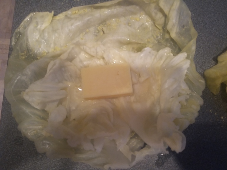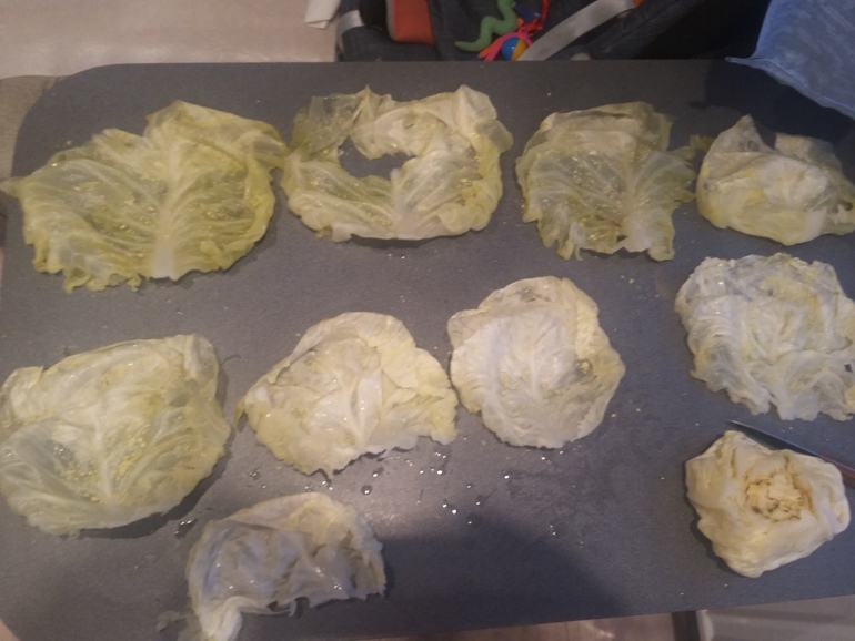 Посыпать солью или бульонным кубиком, капнуть чесночным соусом. Сверху уложить маленькие листья из середины кочна: