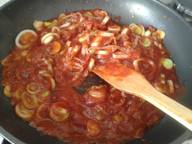 Следом на сковородку положить баночку помидоров в собственном соку: